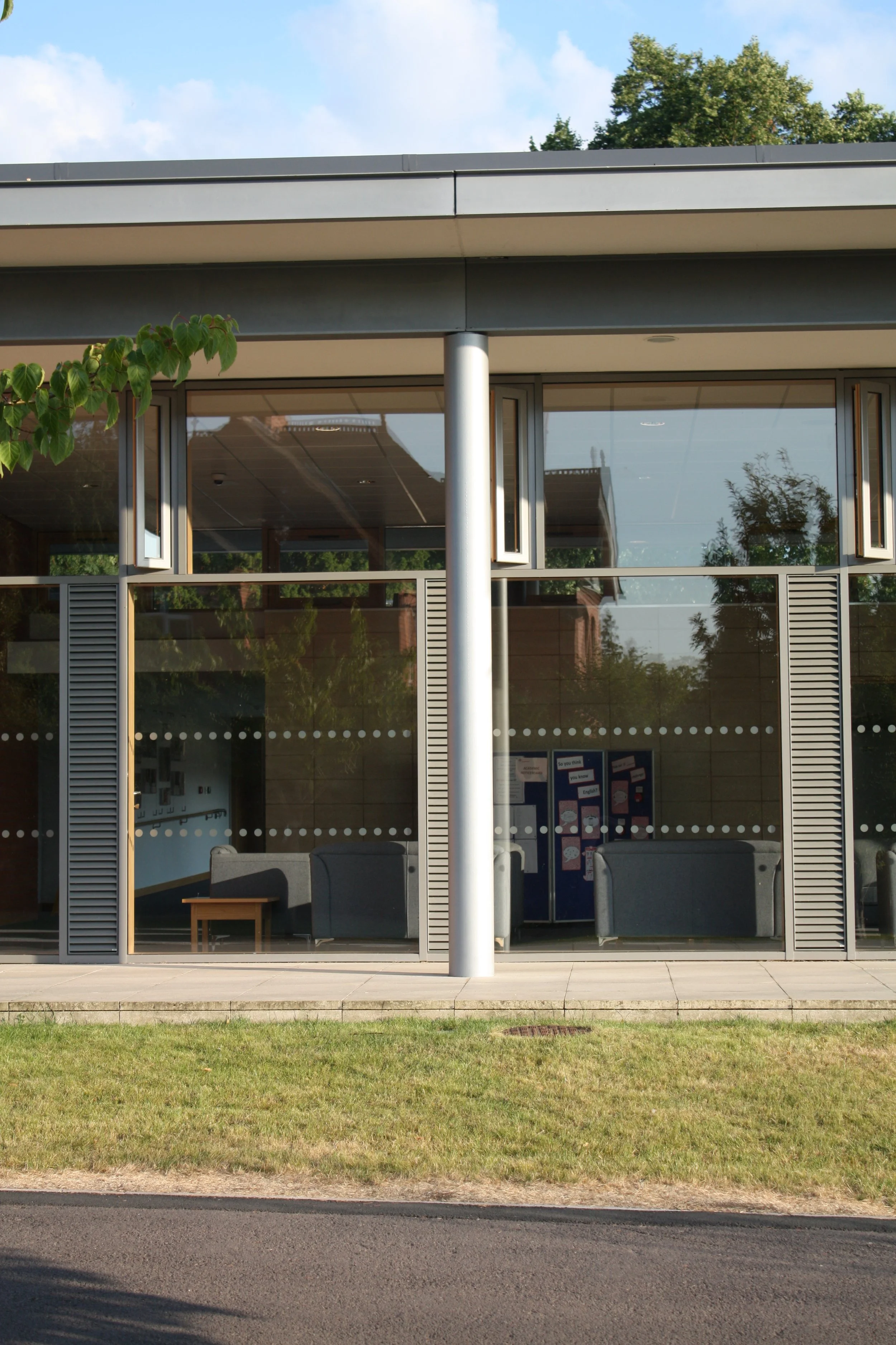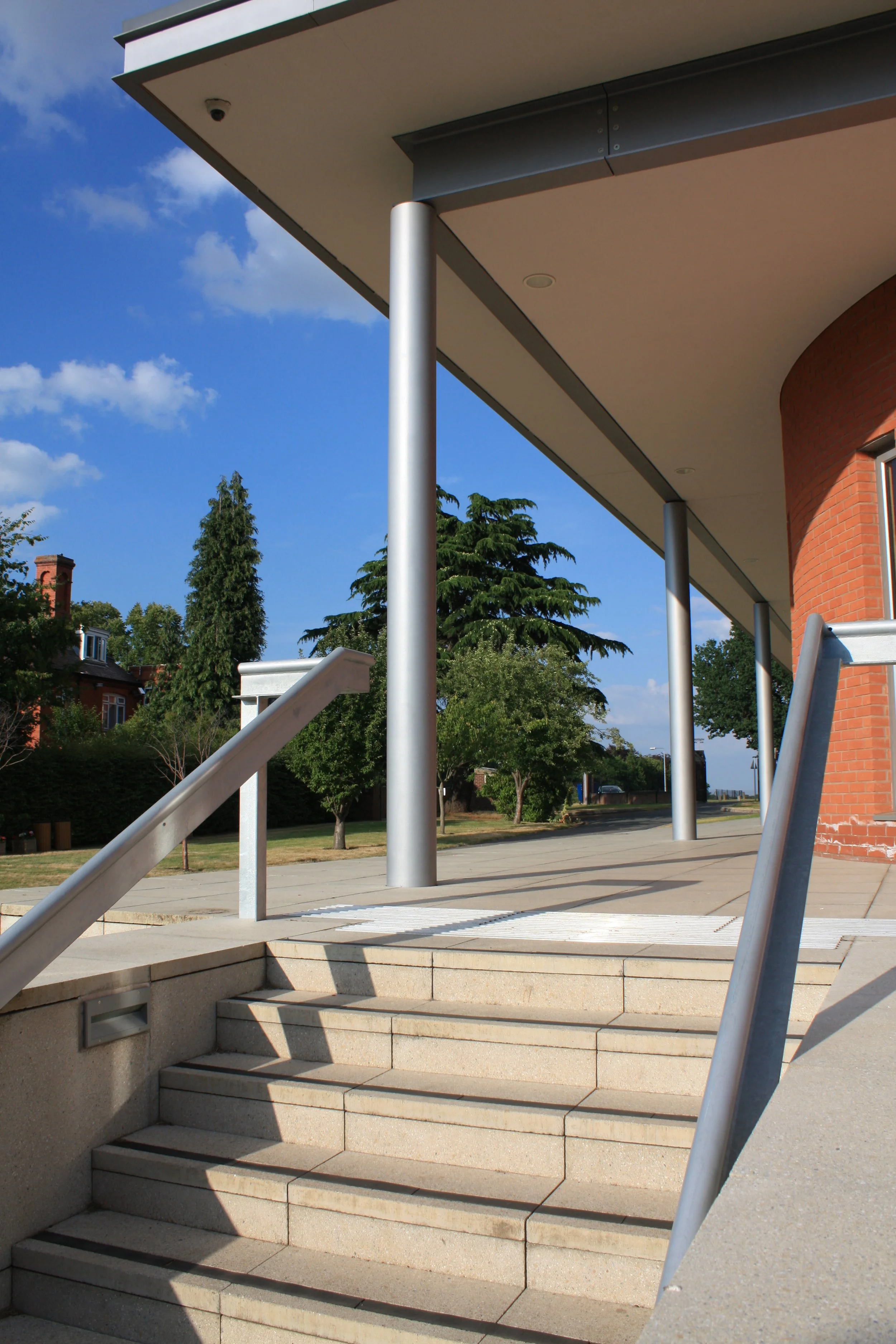 A regular roof supported by columns oversails the architectural elements below, providing a sheltered edge around the building. The use of red brick reflects the surrounding red brick buildings on campus with the curtain walling finished in black aluminium.